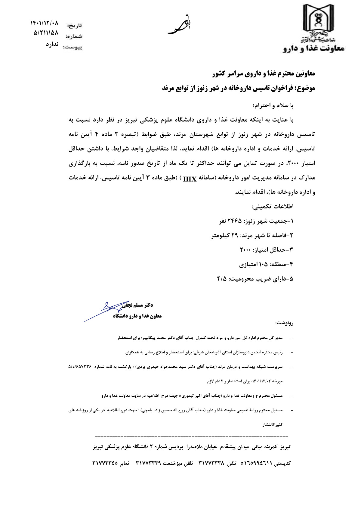 فراخوان تاسیس داروخانه در شهر زنوز از توابع مرند